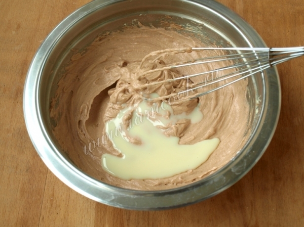 Понемногу вливать сгущённое молоко и сразу перемешивать.