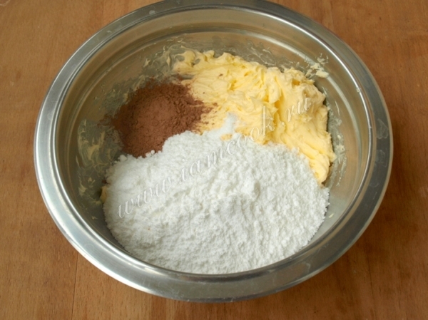 Сливочное масло заранее достать из холодильника, чтоб оно стало мягким, затем хорошо его размять. Добавить к маслу порошок какао, ванилин и сахарную пудру.