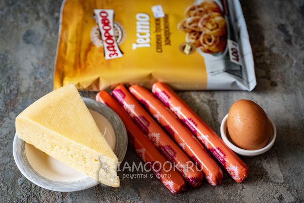 Соберём необходимые ингредиенты для приготовления пирога из слоеного теста с сосиской и сыром.