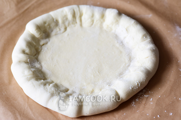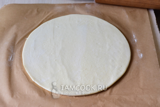 Тесто раскатаем на пергаменте для выпекания и обрежем так, чтобы получился круг диаметром около 30 см.