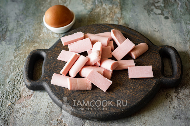 Сосиски освободим от оболочки и нарежем сначала продольно каждую, а затем поперек, как на фото.