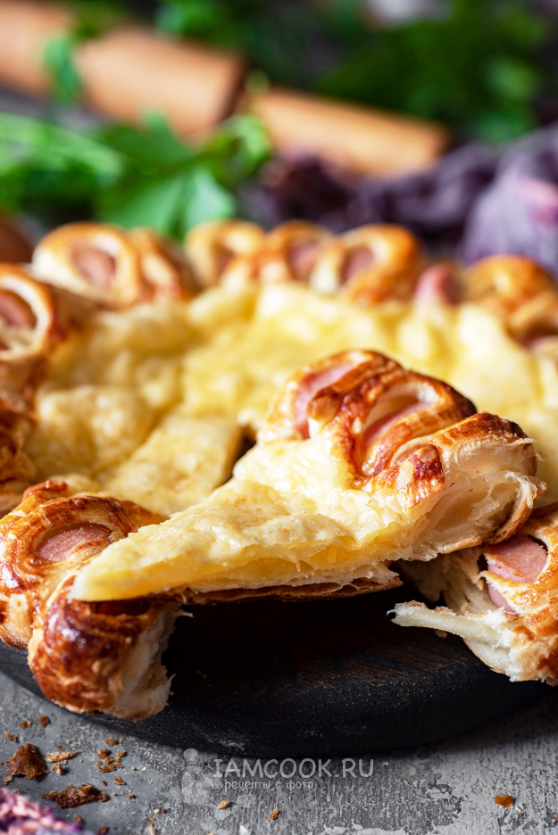 Пирог из слоеного теста с сосиской и сыром вкусный как в горячем виде, так и охлажденный. Приятного аппетита!
