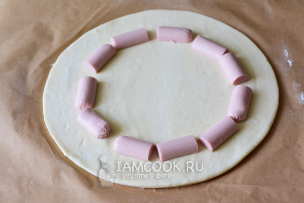 Кусочки сосисок выложим по кругу, отступая от края примерно 2-3 см.