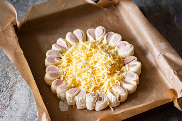 Выложим тертый сыр в центр заготовки пирога, который ограничивают бортики из сосисок в тесте. Пергамент с будущим пирогом перенесем на противень. Поверхность теста смажем взболтанным яйцом, воспользовавшись кулинарной кистью. Будем выпекать пирог около 30 минут в заранее разогретой до 180 градусов духовке.