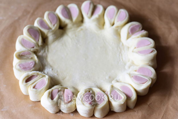 Затем разрежем сосиски в тесте по кругу на небольшие части, которые затем разрежем пополам и вывернем, как на фото, формируя бортики из сосисок в тесте.