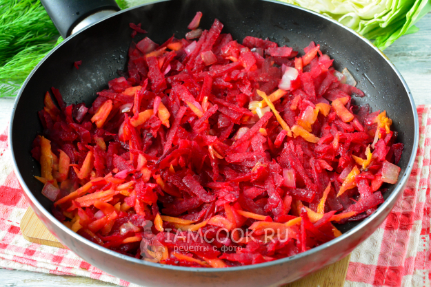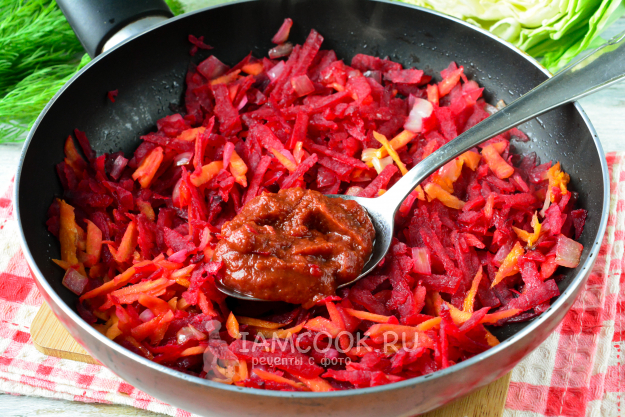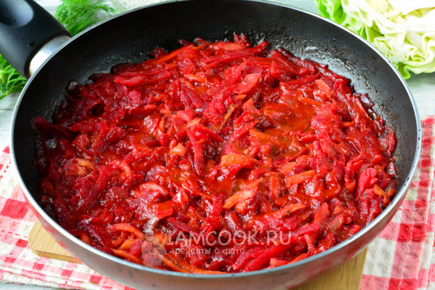Тушите овощи с томатной пастой 5-7 минут на небольшом огне. Если паста густая, влейте пару столовых ложек воды. Зажарка для борща готова. Именно она придает блюду насыщенный красный оттенок.