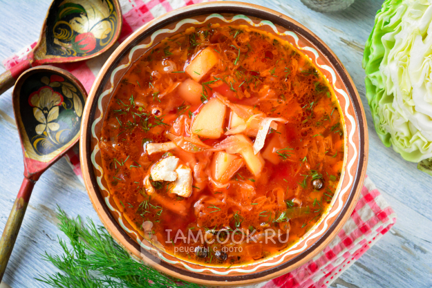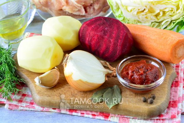 Соберите все ингредиенты для приготовления борща с молодой капустой на курином бульоне.
