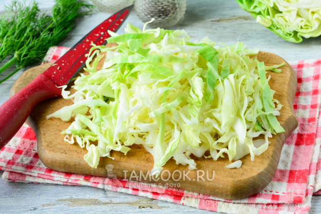Нашинкуйте молодую капусту, но не сильно тонко. Такая капуста очень нежная и варится мгновенно. Резать мелко ее не нужно.