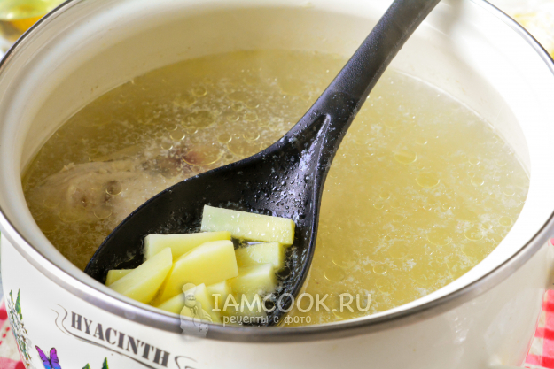 Куриное мясо промойте и выложите в кастрюлю, залейте чистой водой и поставьте вариться на огонь. Закипевшую воду посолите, соберите всю пену и варите бульон при небольшом кипении 15 минут. Затем в бульон выложите нарезанный брусочками картофель и варите все вместе еще 15 минут.
