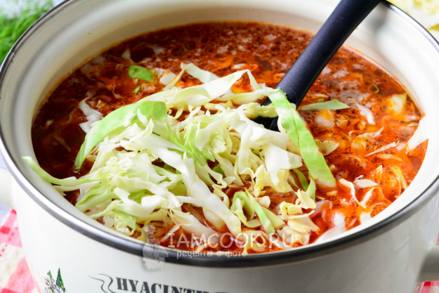 Когда картофель станет мягким, выложите в бульон овощную зажарку и следом добавьте молодую капусту.