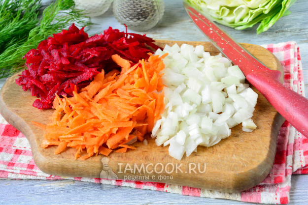 Пока варится бульон с картофелем, подготовьте остальные овощи. Почистите лук, свеклу и морковь. Лук нарежьте кубиками, а морковь со свеклой натрите на терке.