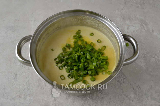 Доведите суп до кипения, проварите на среднем огне 10 минут, постоянно помешивая. Добавьте в кастрюлю нарезанный зеленый лук, проварите 1 минуту и снимите кастрюлю с огня.