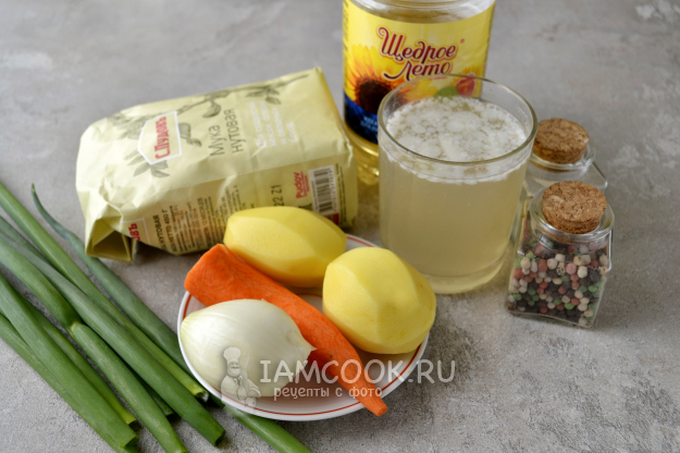 Соберите продукты для приготовления супа из нутовой (гороховой) муки.