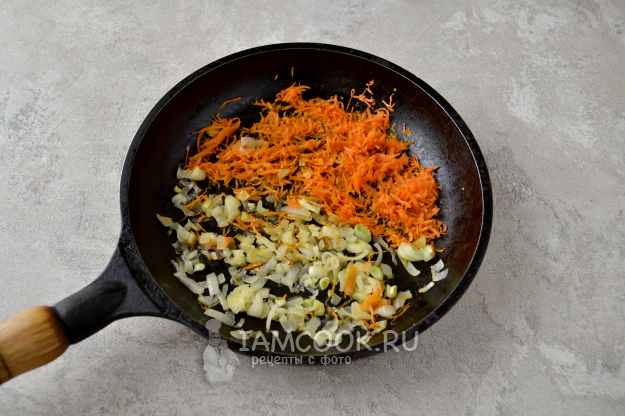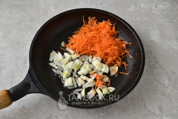 Нарежьте мелким кубиком лук и натрите на мелкой терке морковь. Разогрейте сковороду с растительным маслом, положите подготовленные овощи.