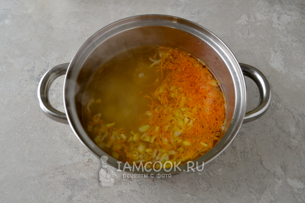 Верните кастрюлю на огонь, постепенно введите разведенную муку в бульон, при этом постоянно перемешивайте, чтобы не образовались комочки.