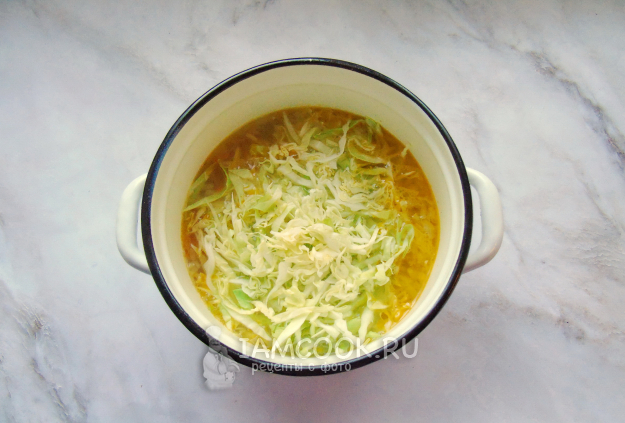 Когда картошка, лук и морковь будут практически готовы, добавьте в кастрюлю нарезанную капусту.