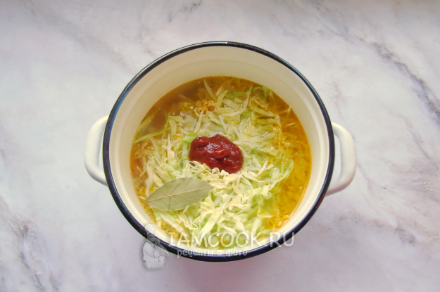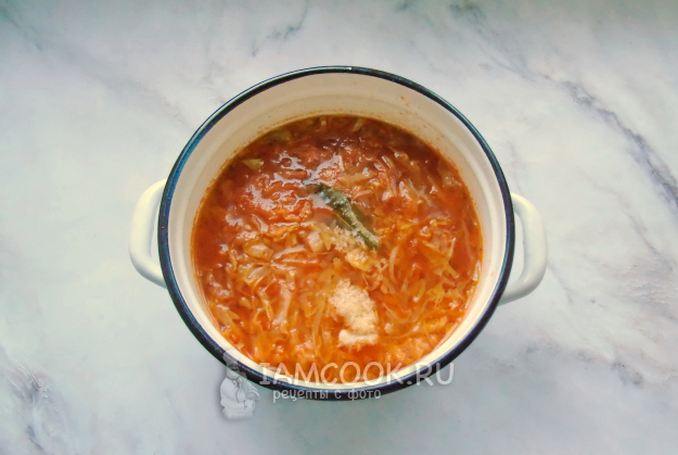 Выложите томатную пасту, лавровый лист. Посолите и поперчите щи.