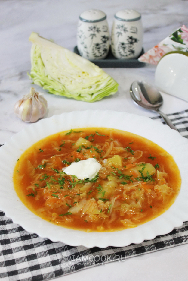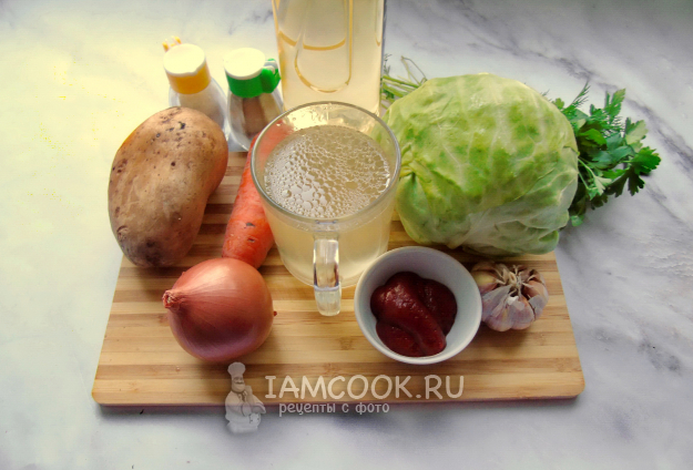 Соберите ингредиенты для приготовления щей с молодой капустой.