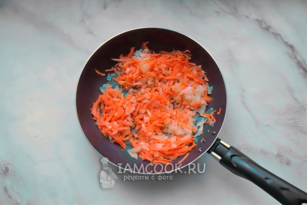 Тем временем лук мелко нарежьте, а морковь натрите на терке. Выложите в сковороду с подсолнечным маслом. Пассеруйте овощи 5-6 минут на небольшом огне.