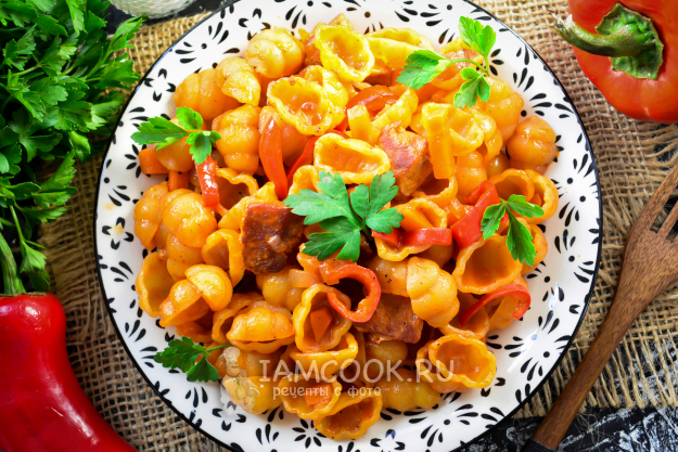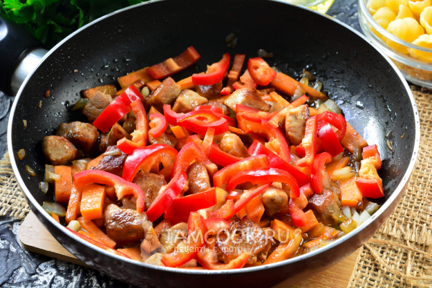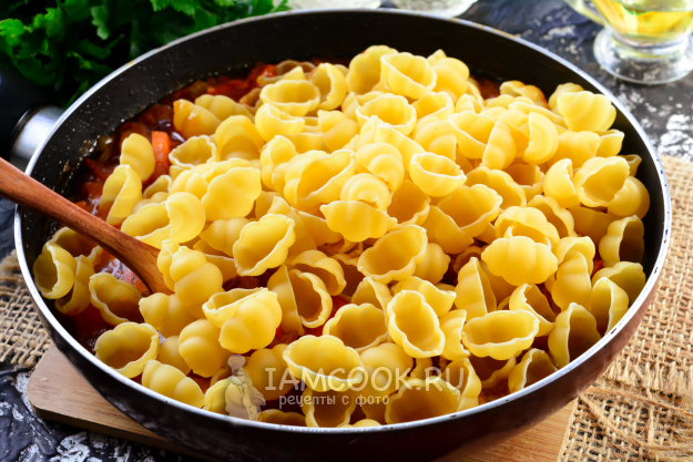 Затем всыпьте макароны и перемешайте. Соуса будет достаточно, чтобы всё приготовилось.
