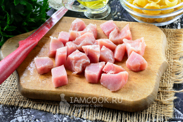 Свинину нарежьте средними кубиками или кусочками. Используйте любую часть свинины, которая подходит для тушения. Мясо может быть с жирком, на ваш вкус.