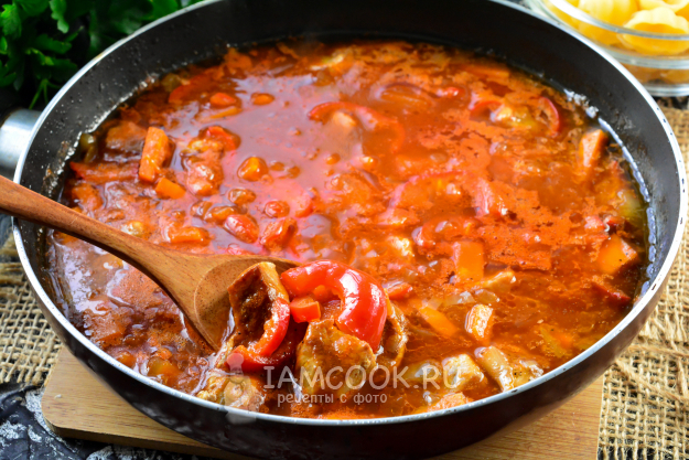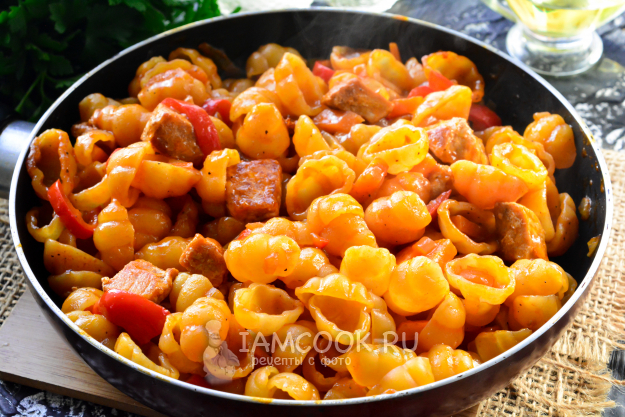 Тушите макароны с мясом на сковороде еще 10-12 минут. Тут все зависит от самих макарон - читайте на упаковке, сколько минут нужно на их приготовление. По желанию добавьте чуть соли. В итоге макароны готовы - они очень вкусные и пропитанные ароматным соусом. Мясо также стало полностью мягким и нежным. Свинина в томатном соусе тоже будет очень вкусной.