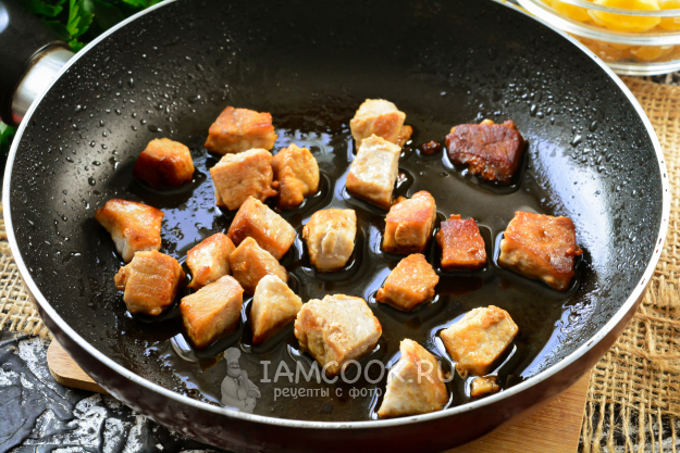Разогрейте растительное масло на сковороде, выложите кусочки свинины и обжаривайте 5-6 минут до золотистой корочки на среднем огне. Мясо помешивайте, чтобы оно равномерно прожарилось.
