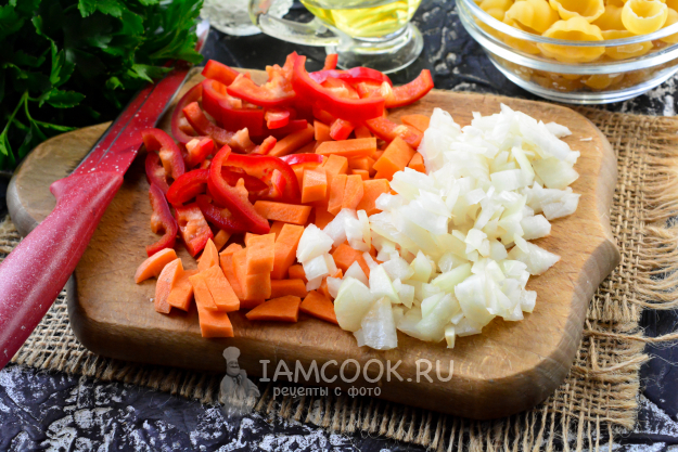 Почистите все необходимые овощи. Морковь и лук нарежьте соломкой, а лук - обычными кубиками.