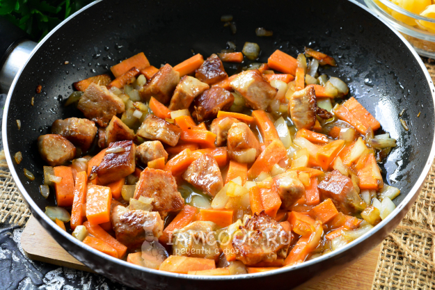 К обжаренному мясу выложите лук с морковкой и пассеруйте всё вместе 2-3 минуты.