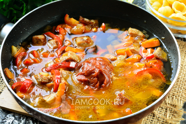 Овощи с мясом посолите и поперчите по вкусу, влейте воду и добавьте томатную пасту. Все перемешайте.
