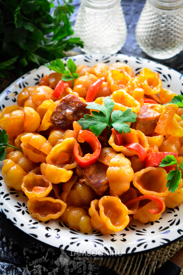 Соберите все продукты для приготовления макарон с мясом на сковороде.