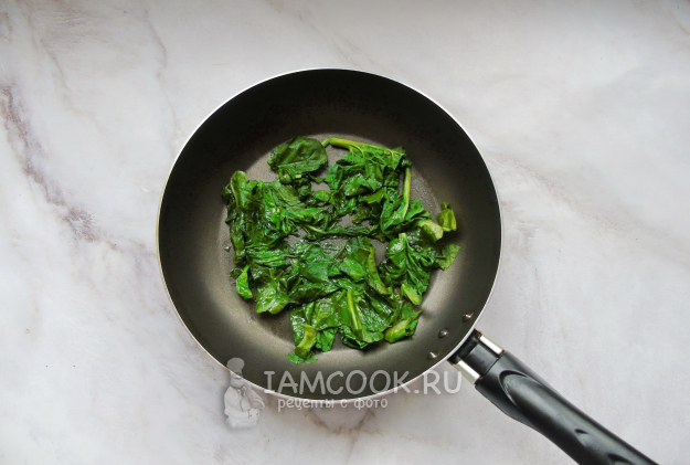 Тем временем приготовьте начинку для пирожков. Шпинат помойте и выложите на сковороду с кусочком сливочного масла. Прогрейте шпинат в течение 1-2 минут.