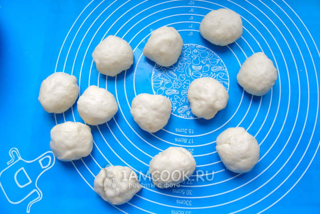 Выложите тесто на стол, присыпанный мукой, обомните и разделите на шарики весом приблизительно 50-60 граммов.