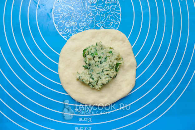 Каждый шарик раскатайте в лепешку. На середину выложите начинку.