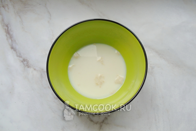 Замесите тесто. В миску накрошите дрожжи. Можно взять сухие, их потребуется 5-6 граммов. Налейте в миску теплое молоко, насыпьте сахар и перемешайте. Через 5-6 минут дрожжи активируются.