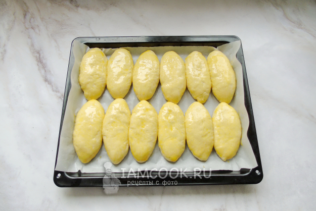 Дайте постоять 25-30 минут при комнатной температуре. После смажьте пирожки яйцом.