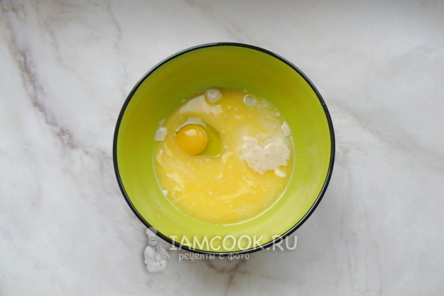 Добавьте яйцо, растопленное сливочное масло и соль.
