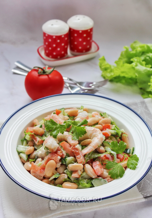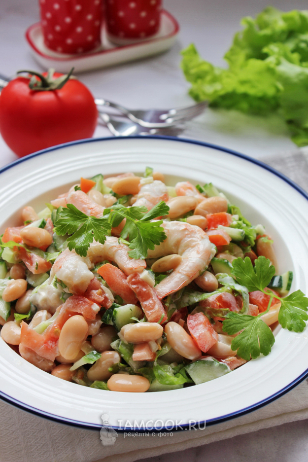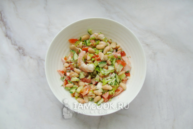 Салат с креветками и фасолью готов. Подавайте на закуску.