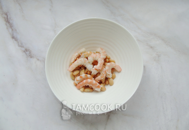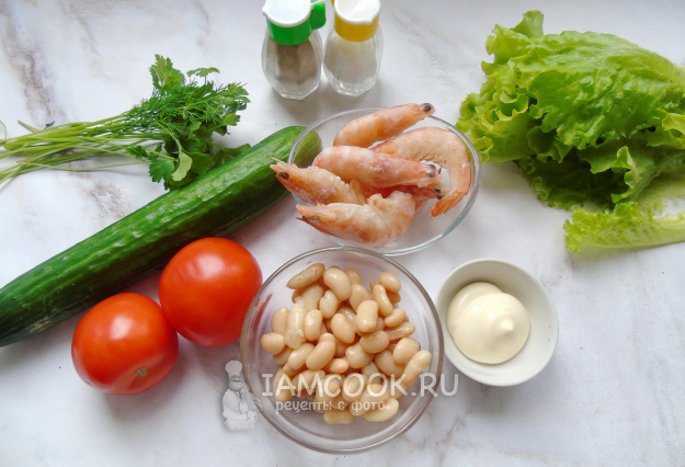 Соберите ингредиенты для приготовления салата с креветками и фасолью.