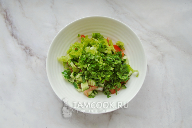 Салатный лист и зелень нарежьте произвольно. Некоторые любят порвать листья салата руками - дело вкуса.