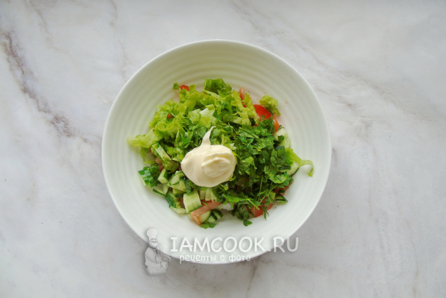 Я заправила салат небольшим количеством майонеза. Выбор заправки - на ваш вкус. Это может быть майонез, сметана, натуральный йогурт, растительное масло с лимонным соком.
