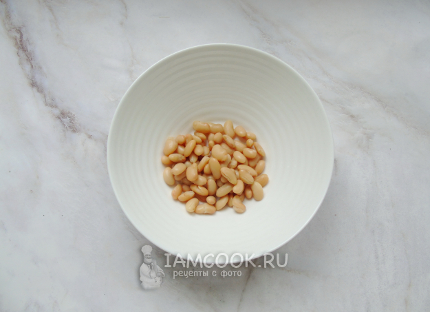 Консервированную фасоль из банки откиньте на дуршлаг и промойте холодной кипяченой водой.