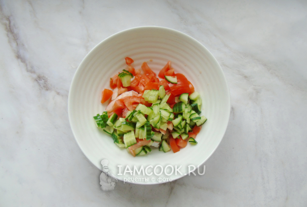 Помидор и огурец мелко нарежьте.