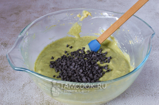 Смешать оба вида муки, соду, разрыхлитель и соль. Ввести в яичную смесь, перемешать и влить молоко. Еще раз перемешать. Добавить шоколадные капли, перемешать.