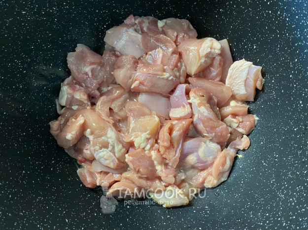 Возьмите глубокую сковороду или казан. Разогрейте растительное масло на сильном огне. Выложите кусочки курицы и слегка обжарьте, пару минут.