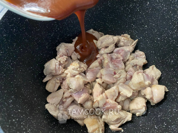 Влейте соус к мясу, накройте крышкой и тушите на маленьком огне 20-25 минут.