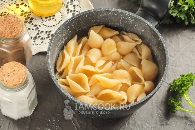 В это время вскипятите 400 мл воды в кастрюле или ковше и всыпьте туда 1 щепотку соли. Добавьте макароны и отварите 8-12 минут - время варки пасты написано на упаковке. Оставьте остывать макароны в бульоне.