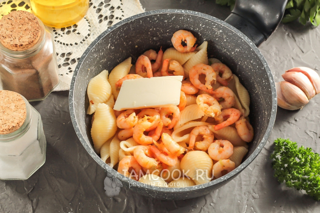 Слейте бульон с макарон и добавьте в емкость креветки вместе с кусочком сливочного масла. Можно обжарить креветки и на сливочном масле - решайте сами. Аккуратно перемешайте. Макароны с жареными креветками полностью готовы!