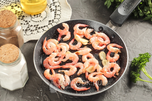 В это время, пока паста отваривается, очистите креветки от панцирей. Если используете королевские, то обязательно удалите и пищевод.