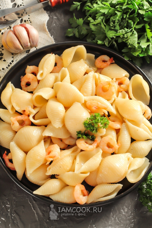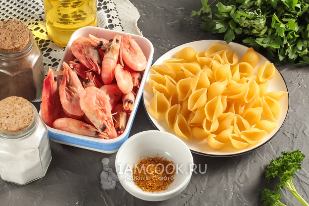 Продукты для приготовления макарон с жареными креветками - перед вами!